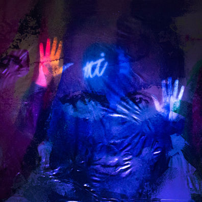 Un artista mascherato dipinge dietro il nylon trasparente.
